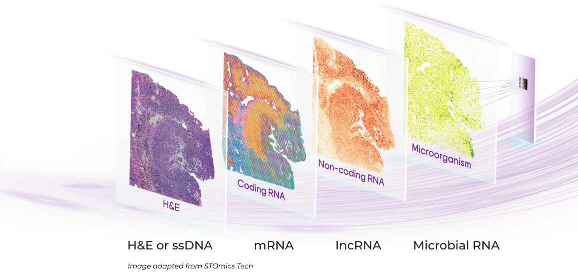 The novel Stereo-seq FFPE chip utilizes spatially-barcoded random probes to efficiently capture mRNA, long non-coding RNA (lncRNA) and microbial RNA in situ. Coding and non-coding RNA are spatially profiled at nanoscale resolution to reveal unprecedented insights.